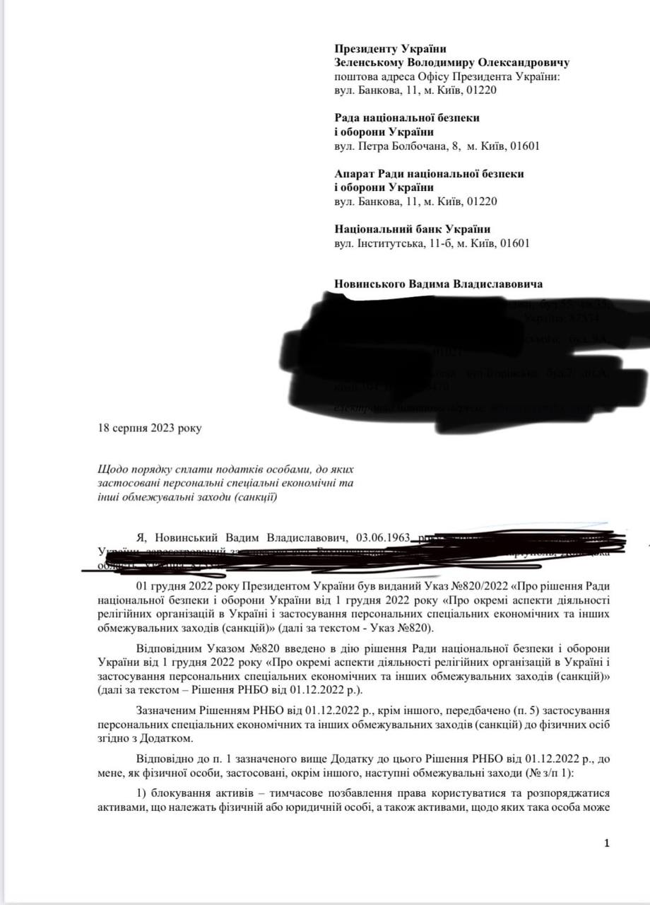 "Я обратился с письмом к президенту Украины, а также к Совету национальной безопасности и обороны Украины, к фискальным органам. Я – гражданин Украины и считаю своей обязанностью платить налоги в своей стране. В декабре 2022 года и в январе 2023 года СНБО Украины ввел против меня санкции за мои религиозные убеждения и за мою верность канонической Украинской православной церкви. Согласно указу президента все мои счета в Украине арестованы. Меня в этой ситуации правовой коллизии интересует вопрос: каким образом я могу заплатить налоги?" – написал Новинский.