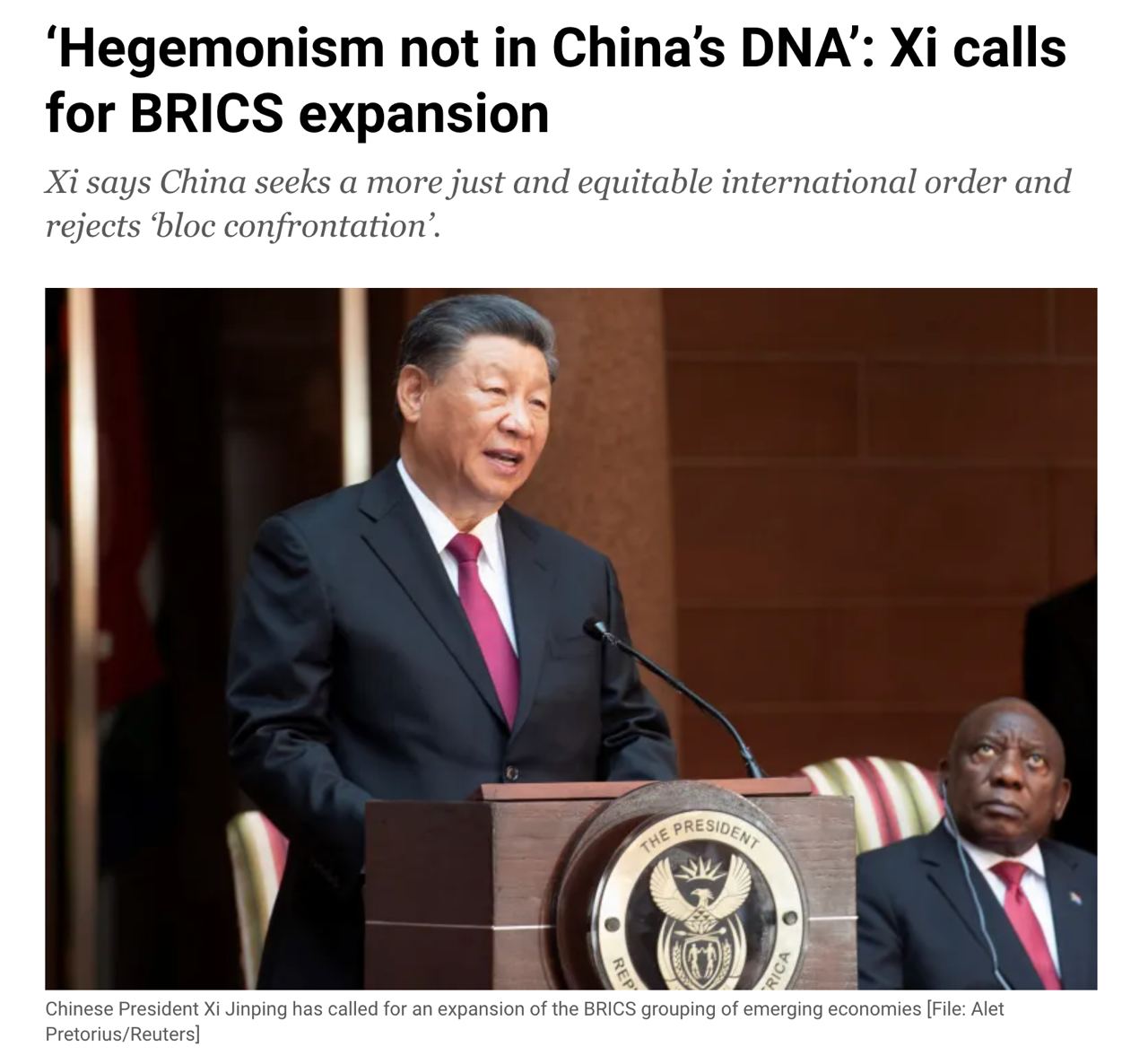 В нем Си Цзиньпин призвал к расширению БРИКС для построения "более справедливого и равноправного международного порядка", заявил, что "гегемонизм не заложен в ДНК Китая", но при этом Пекин "не желает участвовать в соперничестве великих держав" или создавать "блоковую конфронтацию".