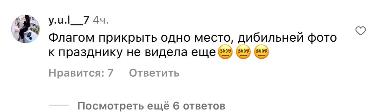 "Это позор для флага, ужас фото"; "Извините, идея фото, конечно, многозначная, это то, что мы все чувствуем уже 1,5 года, можно было флаг хотя бы на спину положить, или как-то по-другому немного сделать? А не на голую пиз@у"; "Флагом прикрыть одно место, дибильней фото к празднику не видела еще", - пишут хейтеры.