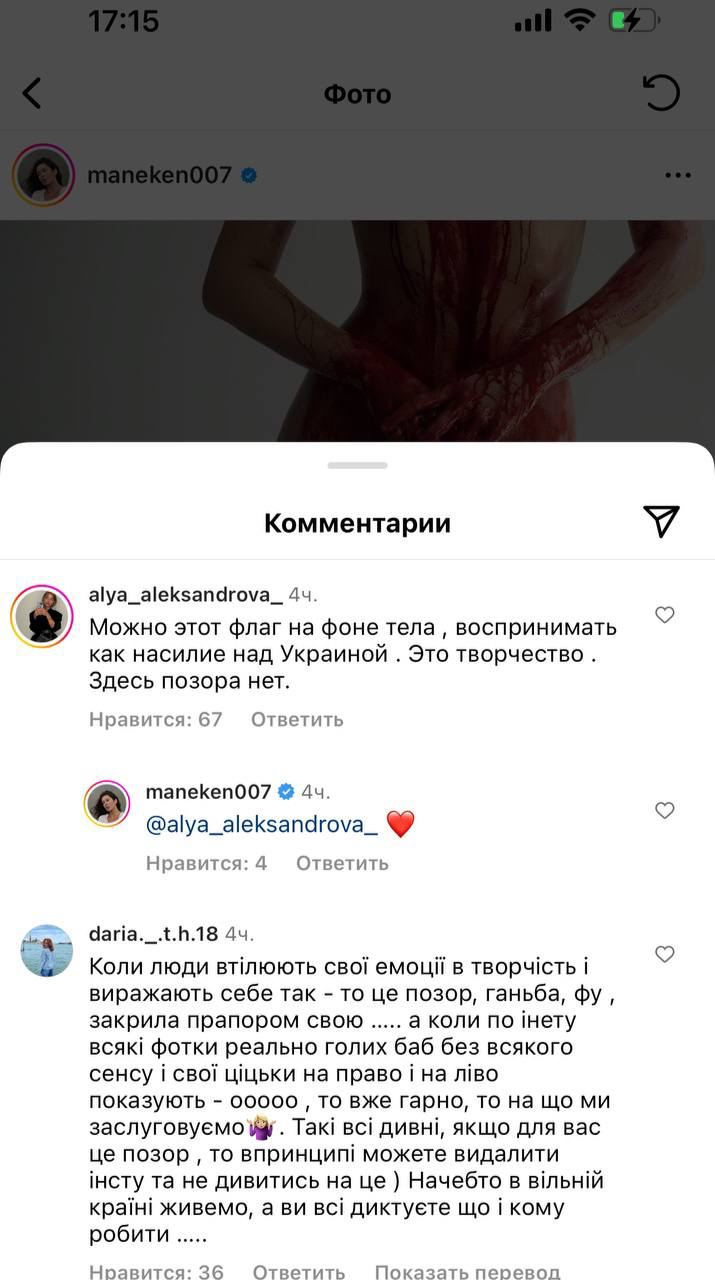 "Можно этот флаг на фоне тела воспринимать как насилие над Украиной. Это творчество. Здесь позора нет"; "Это то, что мы сейчас чувствуем"; "Суть фото способны понять не все, красиво и больно одновременно", - высказались сторонники перформанса.