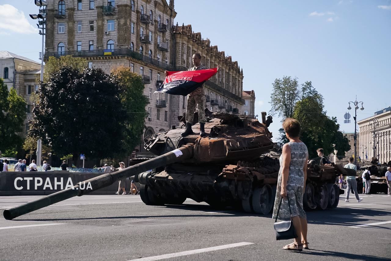 В Киеве на Крещатике в День независимости открыли выставку трофейной российской техники, которую установили на улице раньше, но закрыли оградительной лентой.