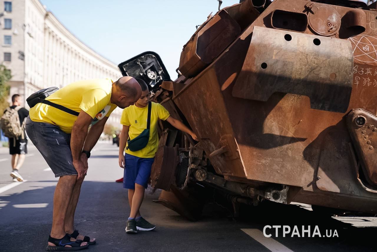 Всего на Крещатике выставили около 28 единиц техники. Среди них — самоходные гаубицы, части сбитых ракет, БМП, БТР танки и другие бронемашины.