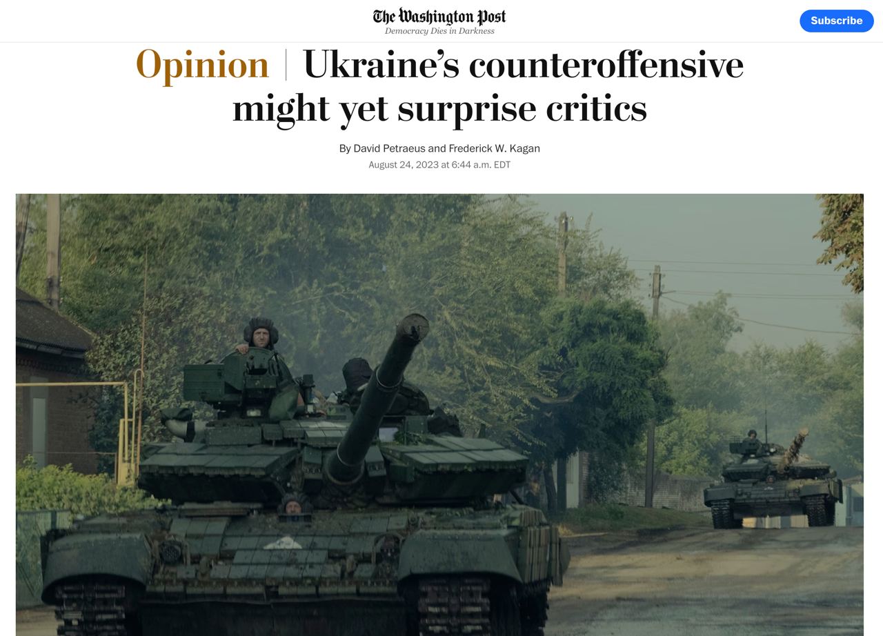 "Наступление Украины далеко от завершения. Фактически, оно все ещё находится на начальной стадии — около десяти недель и, вероятно, продлится еще как минимум четыре месяца", — пишет он.
