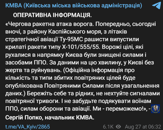 "Очередная ракетная атака противника. Предварительно сегодня ночью, из района Каспийского моря, из самолетов стратегической авиации Ту-95МС рашисты выпустили крылатые ракеты типа Х-101/555/55. Вражеские цели, двигавшиеся в направлении Киева, были уничтожены силами и средствами ПВО", - рассказал Попко.