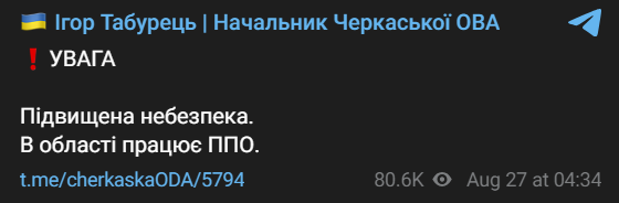 07:40 В Черкасской области во время воздушной тревоги сегодня ночью работала система противовоздушной обороны.