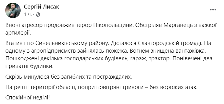 "Россияне продолжили террор Никопольщины. Обстреляли Марганец из тяжелой артиллерии. Также досталось и Синельниковскому району. Попали по Славгородской общине", - написал Лысак.