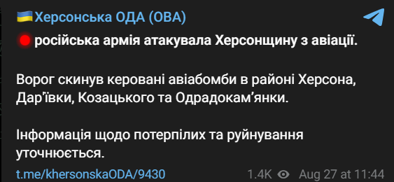 "Враг сбросил управляемые авиабомбы в районе Херсона, Дарьевки, Казацкого и Одрадокаменки", - говорится в сообщении.