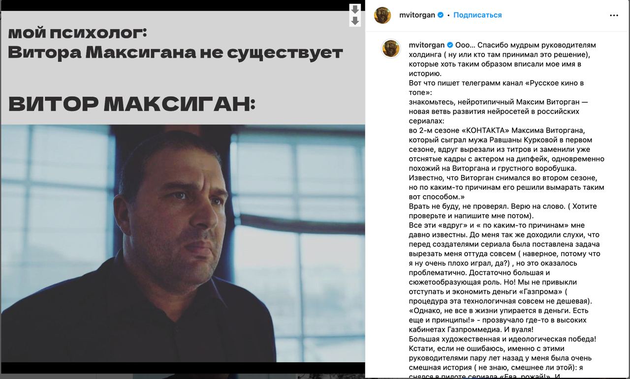В российском сериале "Контакт" заменили дипфейком (технологией, используемой в киноиндустрии для создания цифровых образов) лицо актёра Максима Виторгана, который публично выступал против войны в Украине.