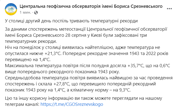 По данным наблюдений метеостанции, 28 августа в Киеве было зафиксировано три температурных рекорда.