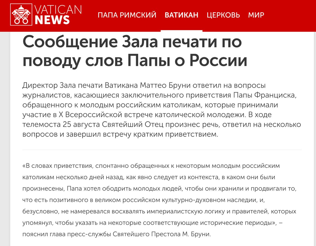 Святой престол говорит, что папа не имел в виду возвеличивать имперское прошлое России.