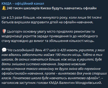 "240 тысяч школьников Киева будут учиться офлайн. Это в 2,5 раза больше, чем в прошлом году, когда только 94 тысячи родителей решили отправить детей на офлайн-обучение" - КГГА.