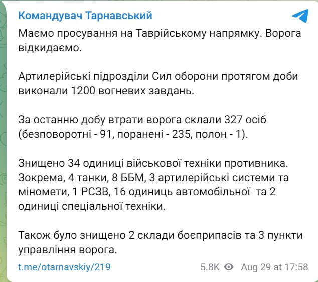 "Имеем продвижение на Таврическом направлении. Врага отбрасываем", - написал генерал.