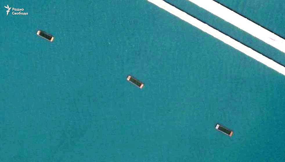 16.37 "Радио Свобода" публикует новые детализированные снимки барж, которые установили возле Крымского моста. Издание предполагает, что они могут быть частично затоплены, так как глубина в этом месте не превышает 2-4 метров, и в будущем будут использованы как основа для заграждения против морских дронов.