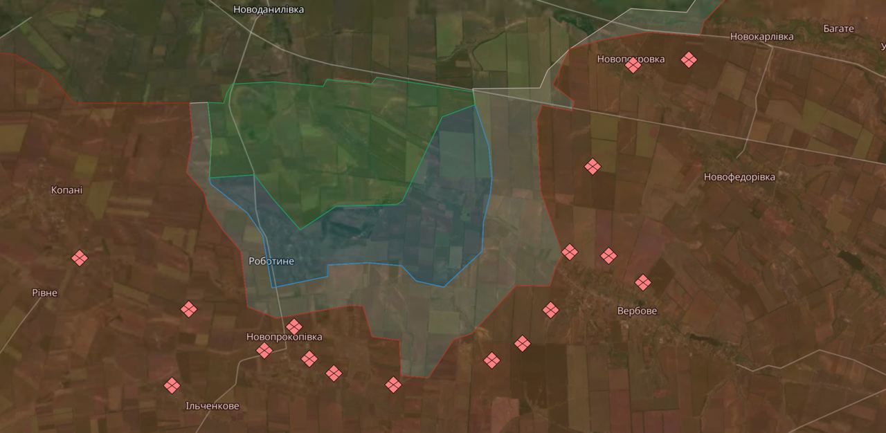 В последнее время в сводках с этого направления все чаще упоминается село Вербовое к востоку от Работино. По данным Генштаба ВСУ, в его направлении есть продвижение. О продвижении украинских войск на 1 километр к Вербовому сообщают и российские военные паблики, заявляя, что бои идут недалеко от окраин села и публикуя их видео.