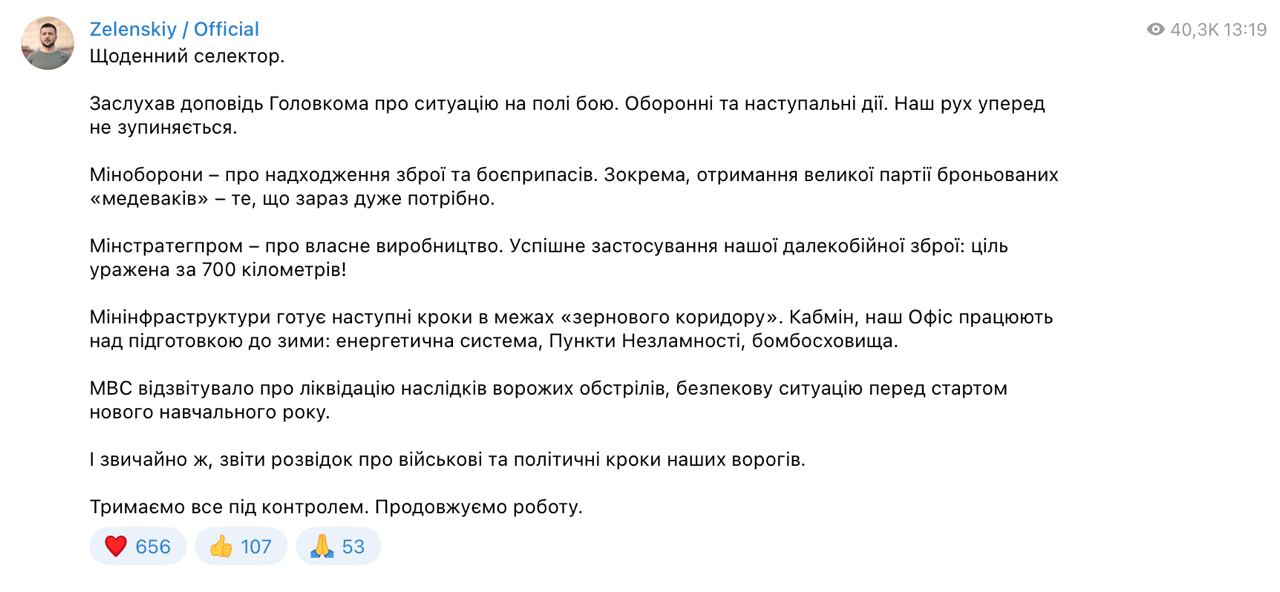 1. Сообщил о селекторном совещании с военными, где обсуждалось наступление и результаты работы нового украинского оружия, которое бьет на 700 км.