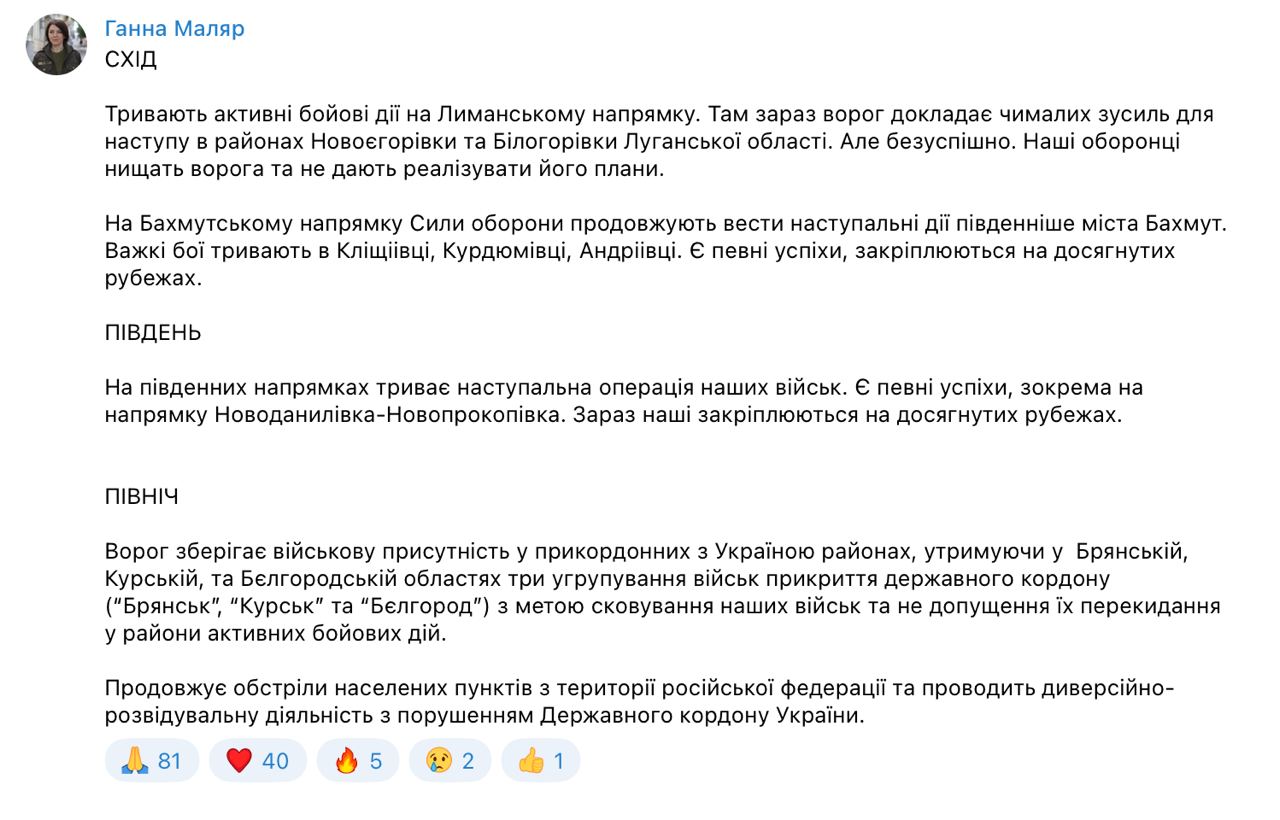 На востоке ВСУ наступают южнее Бахмута, тяжелые бои продолжаются в Клещеевке, Курдюмовке, Андреевке, есть "определенные успехи".