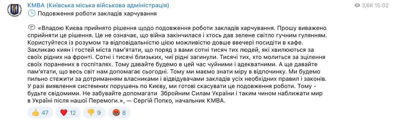 "Прошу взвешенно воспринять это решение. Это не значит, что война закончилась и кто-то дал зеленый свет громким застольям. Пользуйтесь с умом и ответственностью этой возможностью подольше вечером посидеть в кафе. Призываю киевлян и гостей города помнить, что рядом с вами сотни тысяч людей, которые волнуются за своих родных на фронте. Сотни и тысячи близких, чьи родные погибли. Поэтому мы должны знать меру отдыху. Мы будем внимательно следить за соблюдением владельцами и посетителями заведений всех необходимых правил и законов. В случае обнаружения системных нарушений по Киеву мы готовы отменить продление работы", - написал Попко.