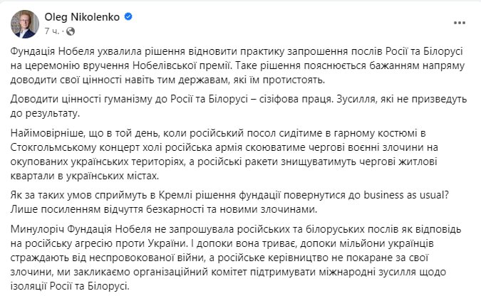 "Доказывать ценности гуманизма России и Беларуси - сизифов труд. Усилия, которые не приведут к результату. Скорее всего, в день, когда российский посол в хорошем костюме будет сидеть в Стокгольмском концерт-холле, российская армия будет совершать очередные военные преступления на оккупированных украинских территориях, а российские ракеты - уничтожать очередные жилые кварталы в украинских городах", - написал Николенко.