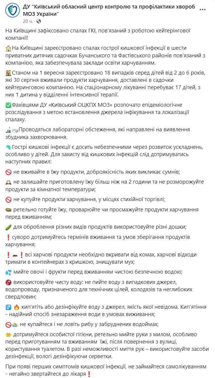 В шести частных садах Бучанского и Фастовского районов в Киевской области зафиксирована вспышка острой кишечной инфекции, связанная с работой кейтеринговой компании.