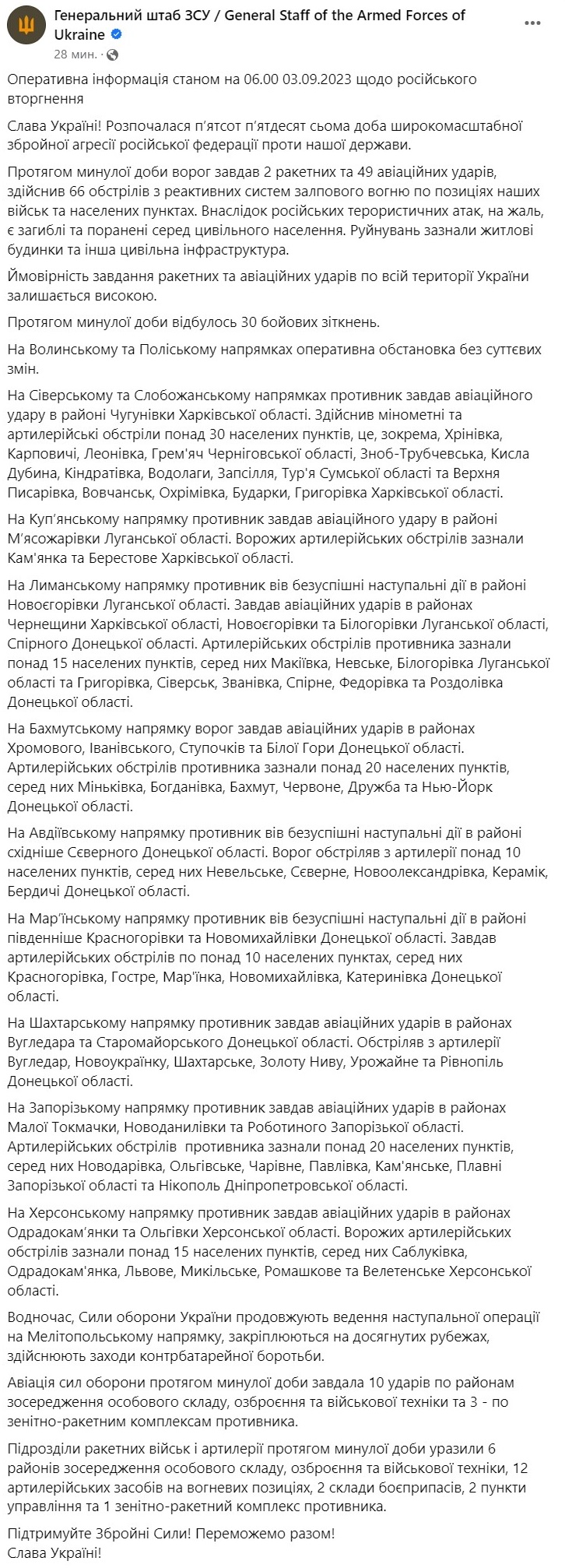 За прошедшие сутки Россия нанесла 2 ракетных и 49 авиационных ударов, совершила 66 обстрелов из реактивных систем залпового огня по позициям наших войск и населенным пунктам. В течение суток произошло 30 боевых столкновений.