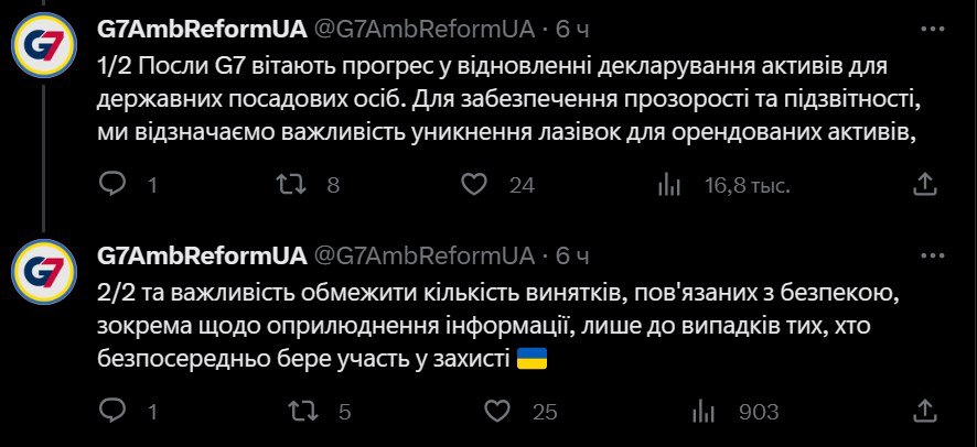 Отметим, что накануне сегодня послы "Большой семерки" призвали Украину ограничить количество исключений из обязательного декларирования.