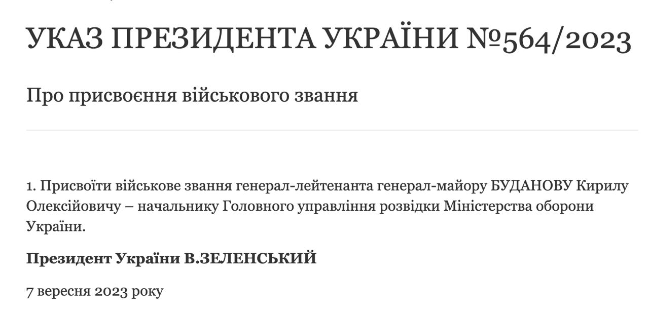 "Присвоить воинское звание генерал-лейтенанта генерал-майору Буданову Кириллу Алексеевичу – начальнику Главного управления разведки Министерства обороны Украины", - сказано в тексте документа.