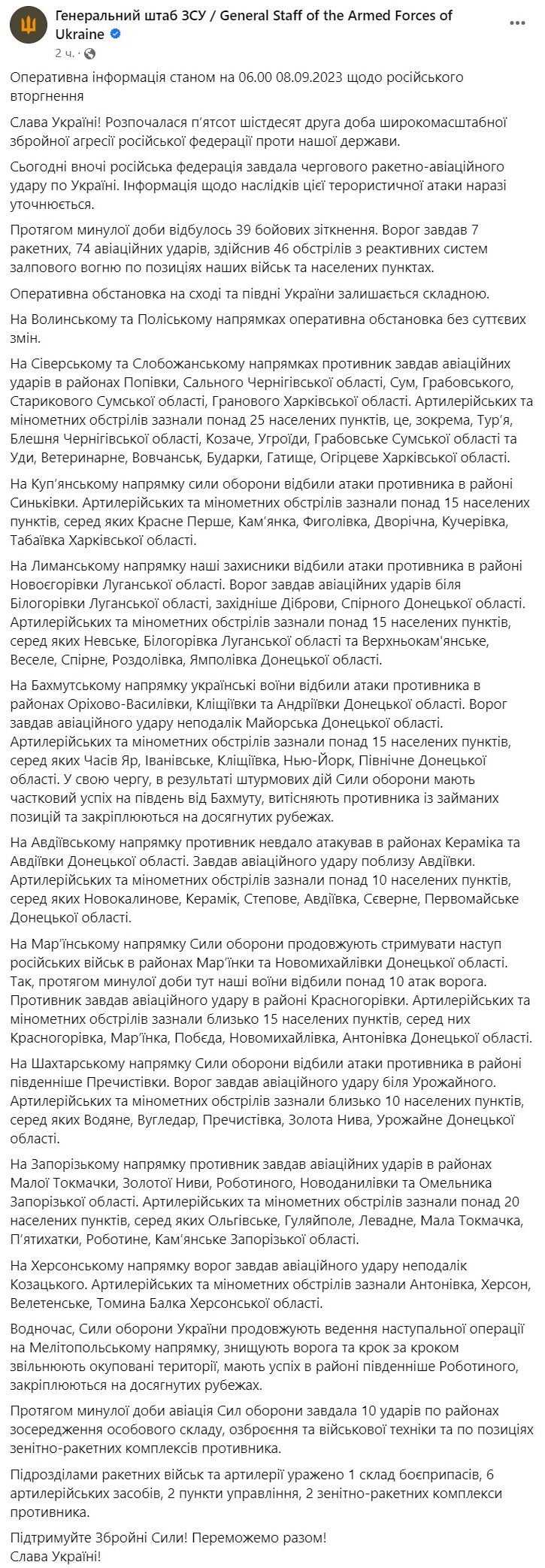 За прошедшие сутки произошло 39 боевых столкновений. Враг нанес 7 ракетных, 74 авиационных ударов, совершил 46 обстрелов из реактивных систем залпового огня по позициям наших войск и населенным пунктам.