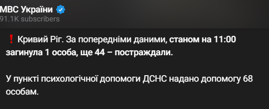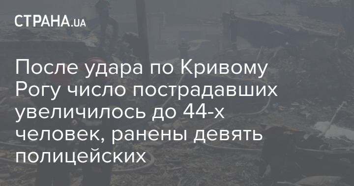 Число пострадавших после ракетного удара по Кривому Рогу увеличилось до 44-х человек. Об этом сообщили в МВД.