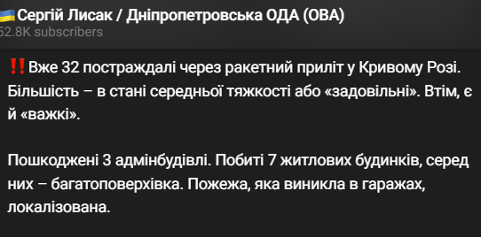 Также глава Днепропетровской ОВА Сергей Лысак сообщил, что большинство пострадавших в "удовлетворительном" состоянии или в состоянии средней тяжести, однако есть и в тяжелом.