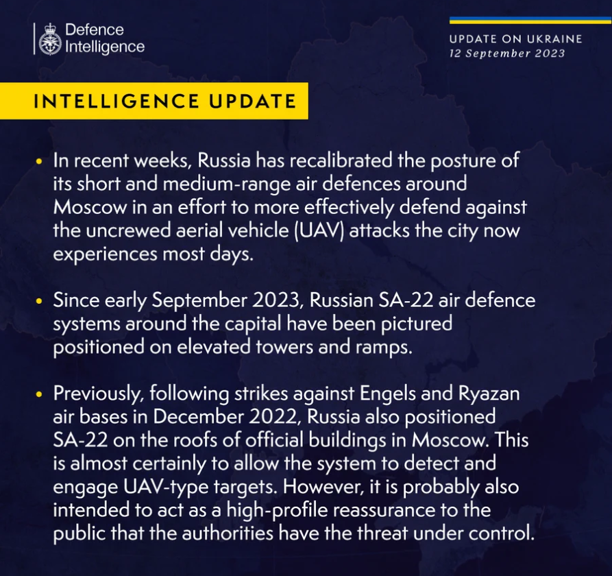 С начала сентября 2023 года российские системы ПВО SA-22 вокруг столицы РФ были размещены на возвышенных башнях и пандусах. Ранее, после ударов по Энгельсской и Рязанской авиабазам в декабре 2022 года, Россия также разместила SA-22 на крышах официальных зданий в Москве, отмечают в британской разведке.