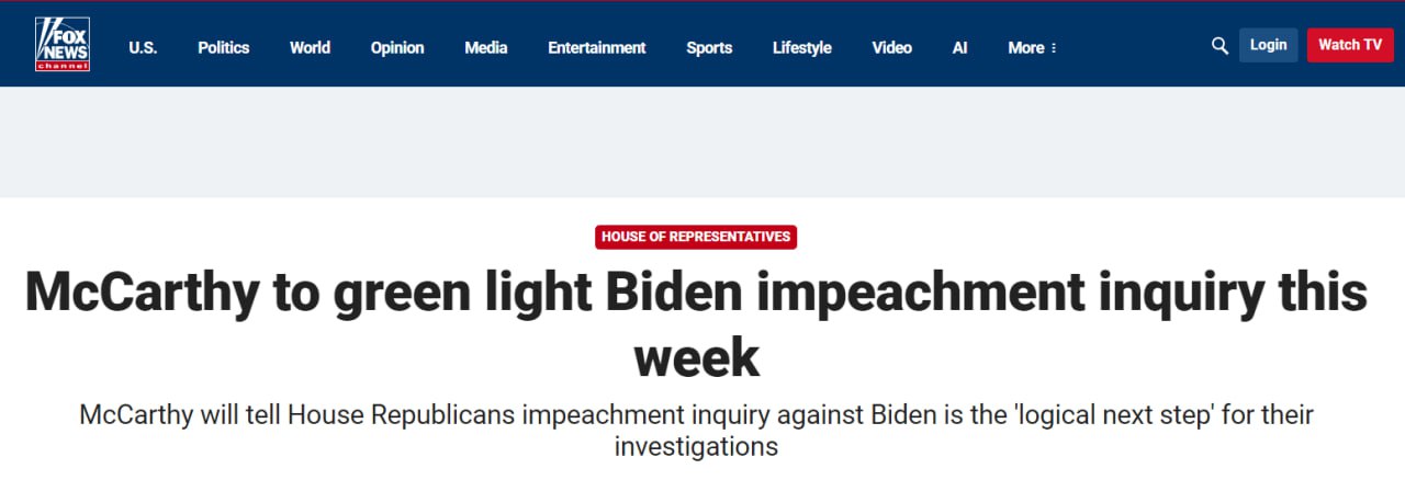 В конце августа телеканал CNN сообщил, что спикер палаты представителей американского конгресса Кевин Маккарти и несколько высокопоставленных представителей Республиканской партии начали формировать стратегию запуска расследования в рамках процедуры импичмента Байдена. Также сообщалось, что член Палаты представителей США, республиканец Грег Стюби намерен внести на рассмотрение резолюцию по вынесению импичмента действующему президенту США.