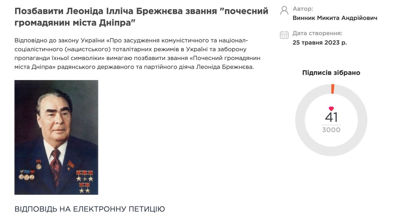 В своем ответе они пишут, что Брежнев был награжден званием "Почетный гражданин города Днепропетровска", которое потеряло силу в 2017 году, когда было введено звание "Почетный гражданин города Днепра". А старого звания можно лишить только после личного обращения гражданина или вступления в законную силу обвинительного приговора в его отношении.