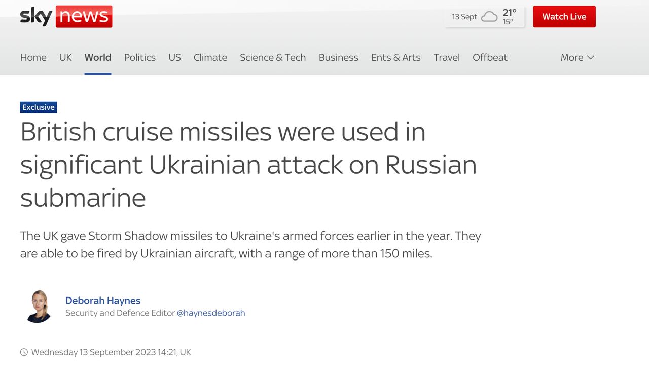 Британский телеканал Sky News подтверждает, что Украина атаковала штаб Черноморского флота РФ в Крыму дальнобойными ракетами Storm Shadow.