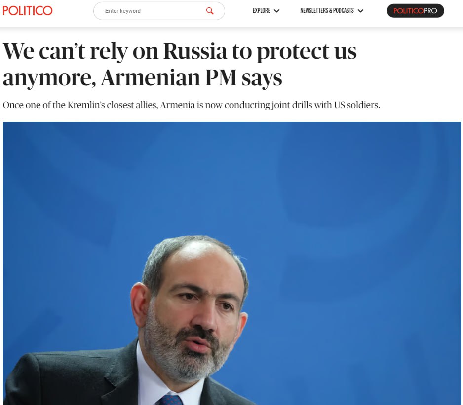 Politico, не приводя прямых цитат, сообщает, что Пашинян признает необходимость отказаться от старого союзника в лице России, и отмечает, что предстоит пройти долгий путь, прежде чем западные страны будут рассматриваться как предлагающие полную поддержку, в которой нуждается Армения.