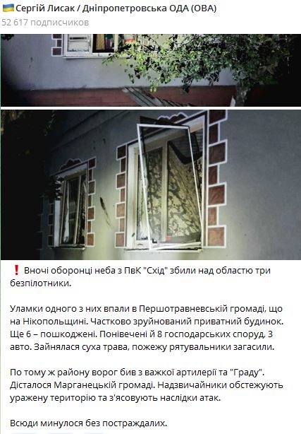 07.35 Ночью над Днепропетровской областью сбили три беспилотника.