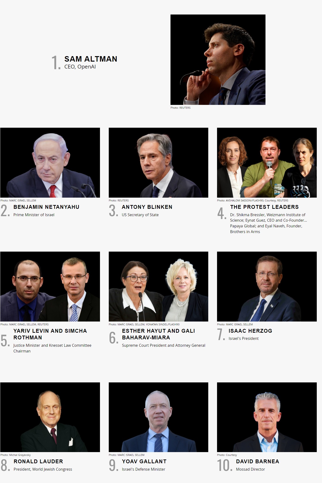 • лидеры израильских протестов Шикма Бресслер, Институт науки Вейцмана; Эйнат Гез, генеральный директор и соучредитель Papaya Global; и Эяль Наве, основатель Brothers in Arms (4-е место);