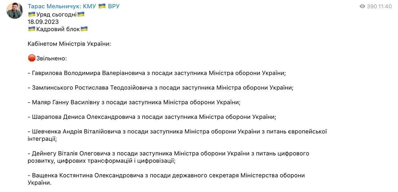 Уволены с должностей заместителей министра обороны: Анна Маляр, Денис Шарапов, Владимир Гаврилов, Ростислав Замлинский. Кроме того, с должности заместителя министра обороны Украины по вопросам европейской интеграции уволен Андрей Шевченко, а с должности заместителя по вопросам цифрового развития, цифровых трансформаций и цифровизации Виталий Дейнега.