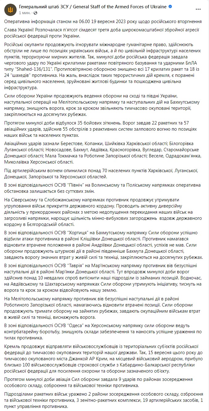 Во вторник, 19 сентября, в Украине идет 573-й день войны с Россией.
