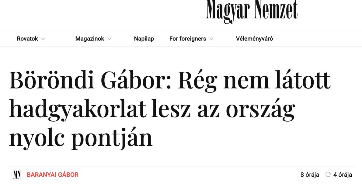 "В ноябре мы проведем гораздо более масштабные учения, во время которых не только осуществим военные маневры в восьми населенных пунктах страны, но и оценим возможности сотрудничества венгерских сил обороны и гражданской администрации", – сказал Бёрёнди.