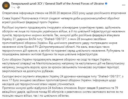 Утром, 20 сентября, Генштаб ВСУ обнародовал сводку о ситуации на фронте.