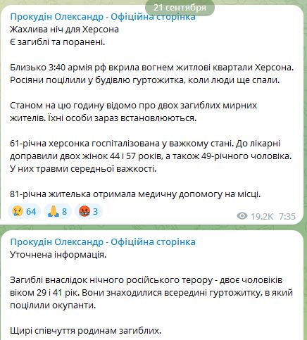 "Около 3:40 армия России покрыла огнем жилые кварталы Херсона. Россияне попали в здание общежития, когда люди еще спали" - написал глава ОВА.