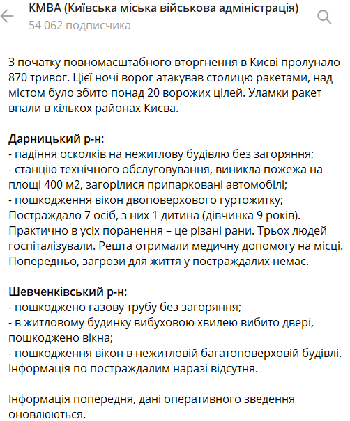 Ранее мэр Виталий Кличко сообщал о повреждениях в Голосеевском и Святошинском районах Киева. Но они в сводке КГВА не упоминаются.