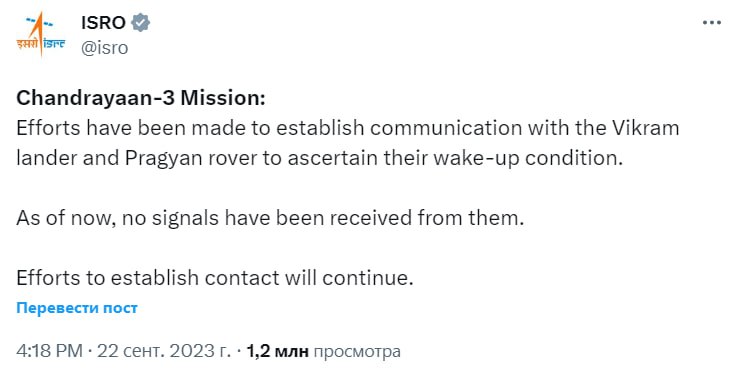 "Предпринимаются попытки установить связь с посадочным модулем "Викрам" и луноходом "Прагьян", чтобы выяснить их состояние после пробуждения от спящего режима. На настоящий момент сигнала от них не получено. Попытки установить контакт продолжатся", — говорится в сообщении ISRO.