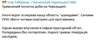 Утром 26 сентября в Черкасской области "Шахеды" ударили по объекту инфраструктуры.