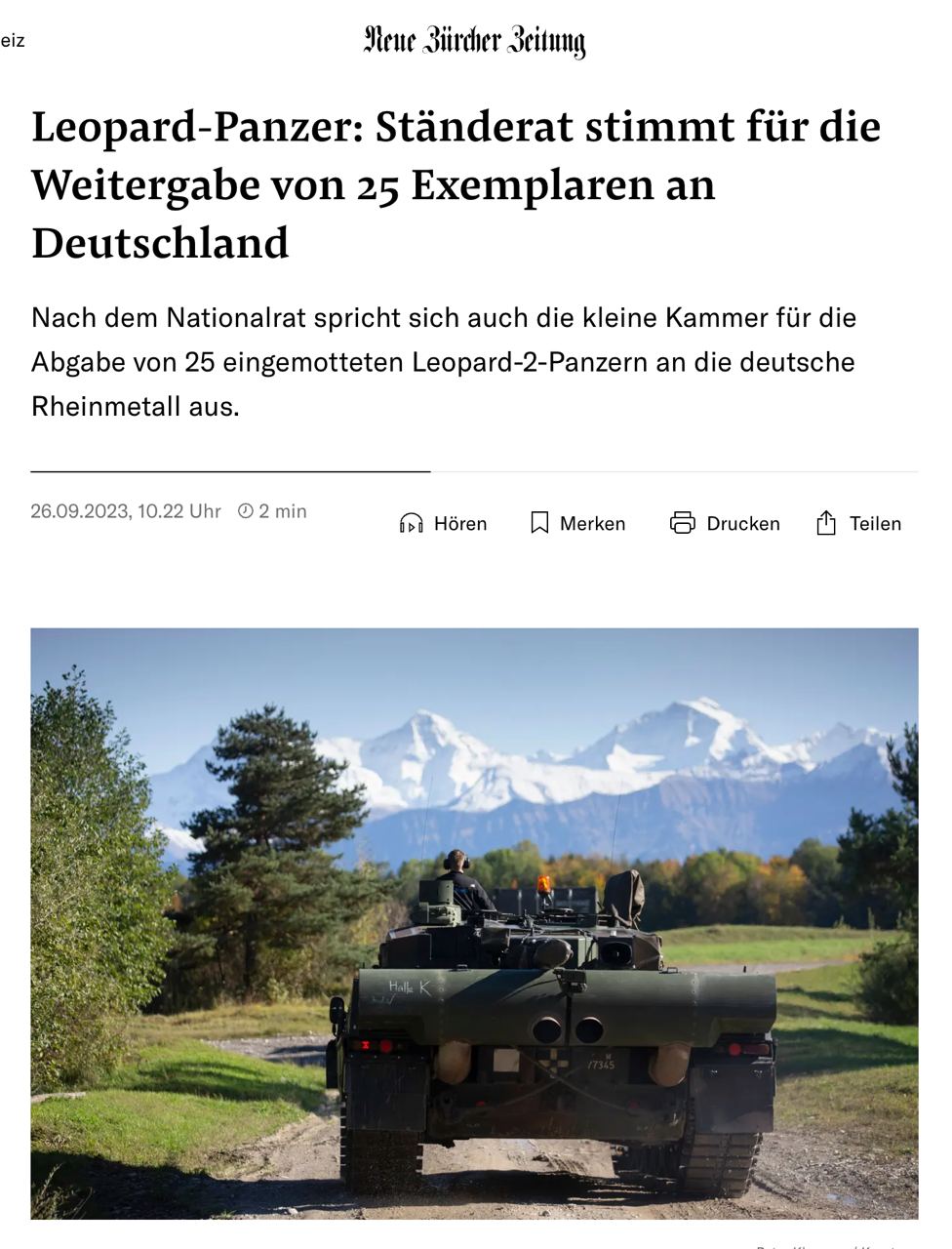 Парламент Швейцарии окончательно одобрил вывод из эксплуатации 25 танков Leopard 2 для дальнейшей продажи немецкой компании Rheinmetall.