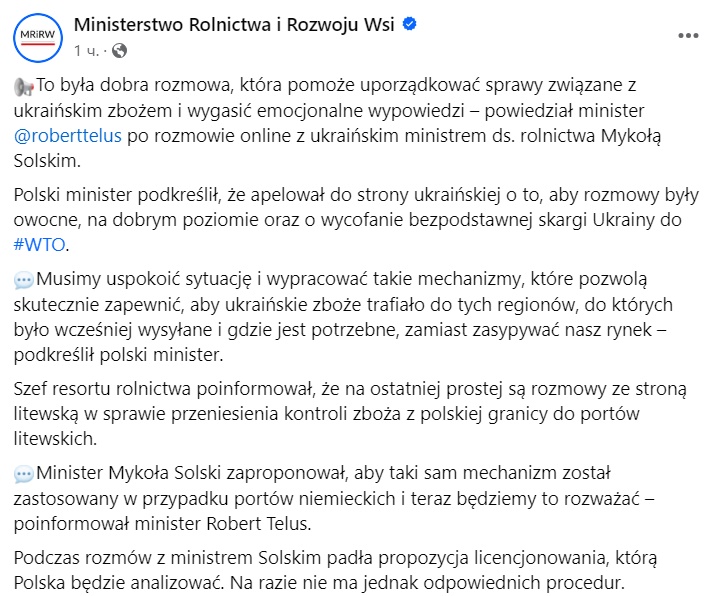 "Это был хороший разговор, который поможет разобраться в вопросах, связанных с украинским зерном, и погасить эмоциональные высказывания", - заявил министр Роберт Телус.
