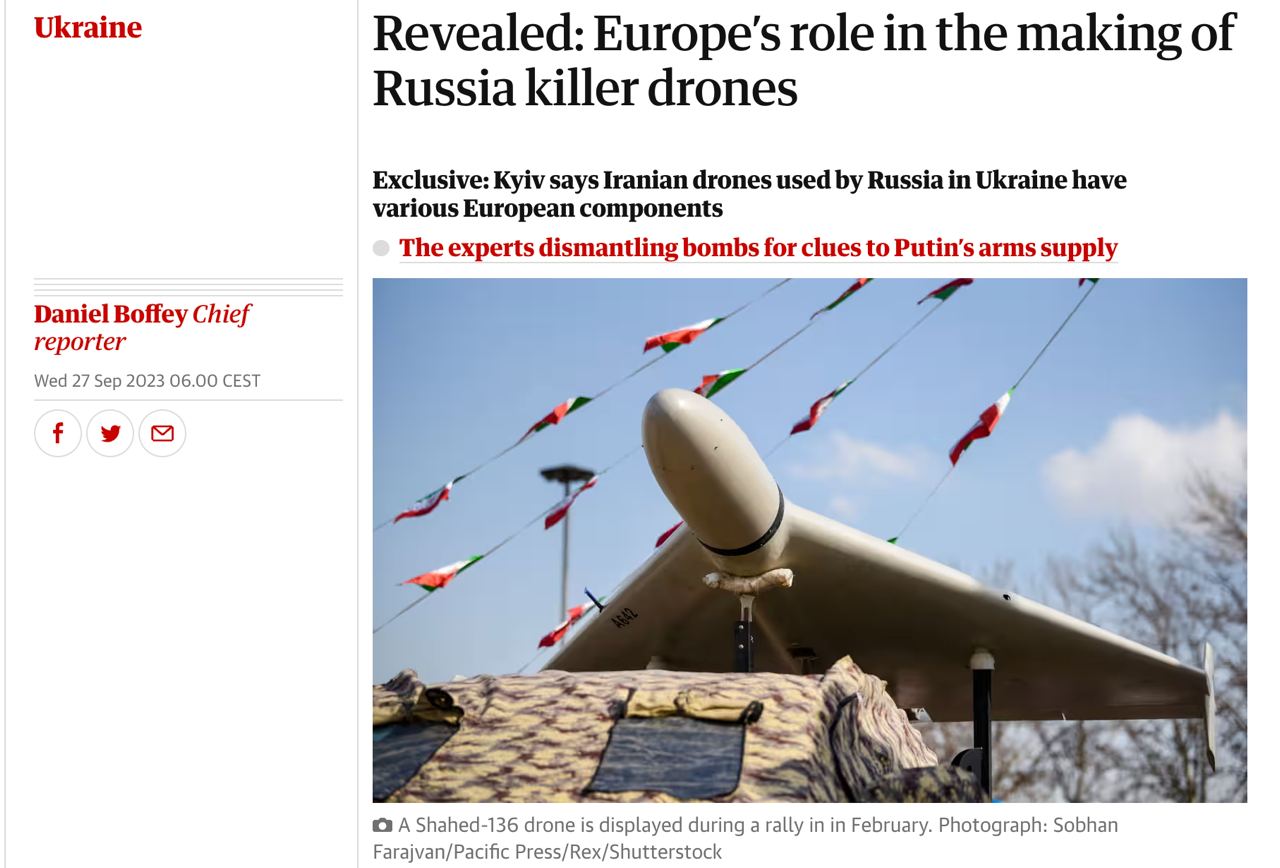 Украина заявила, что "Шахеды" имеют 52 европейских компонента пяти компаний со штаб-квартирами в США, Швейцарии, Нидерландах, Германии, Канаде, Японии и Польше. Почти весь импорт деталей в Иран идет из Турции, Индии, Казахстана, Узбекистана, Вьетнама и Коста-Рики.