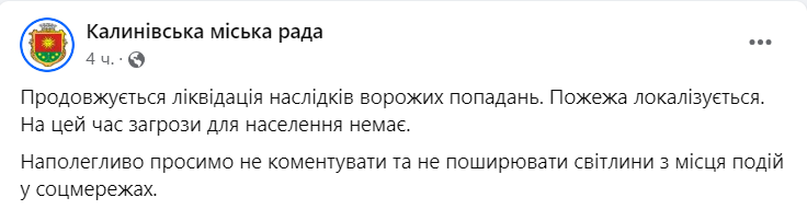 Местные власти сообщают, что удар наносился по Калиновке. Горсовет призвал не выкладывать кадров с места прилета. Сообщается, что пожар ещё тушат.