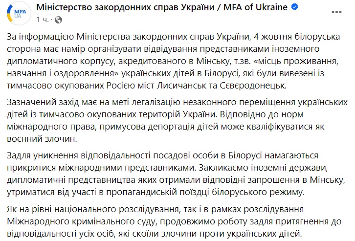 Беларусь собирается организовать посещение представителями иностранного дипломатического корпуса так называемых "мест проживания, обучения и оздоровления" украинских детей, вывезенных из оккупированных РФ Лисичанска и Северодонецка.