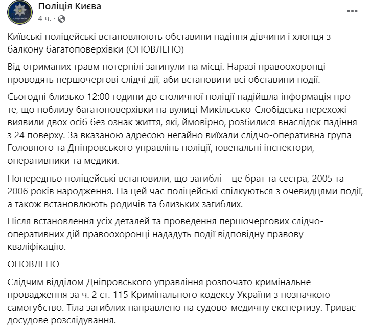 Ранее мы писали, что в Киеве две 12-летние девочки совершили самоубийство, прыгнув с 15-го этажа. Их обнаружили мертвыми на улице Михаила Драгоманова. Следователи квалифицировали произошедшее как самоубийство. Устанавливаются все детали трагедии.